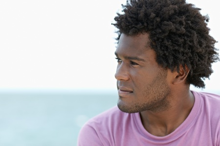 portrait of young african american guy looking away near the sea. Horizontal shape; head and shoulders; copy space