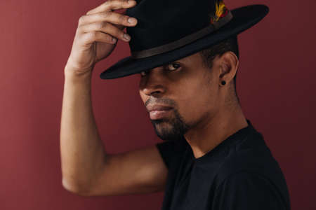 Portrait of handsome young African man smiling in black t-shirt and hat on burgundy background