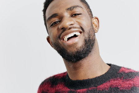 Happy African man stands and smiles. Closeup. Portrait.