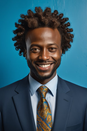 Portrait of an elegant sexy smiling African man with dark, perfect skin, red long hair, on a blue background. Advertising of cosmetic products, spa treatments, shampoos and hair care products, dentistry and medicine, perfumes and cosmetology for men.