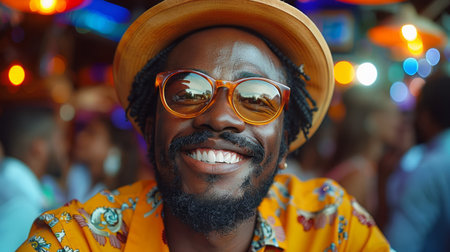 Happy young African man in Hawaiian necklace standing against red background : Generative AI
