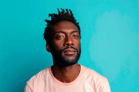 Close-up photo capturing a man with dreadlock hairstyle against a vibrant turquoise background
