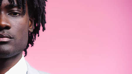 Metrosexual black man. Trendy look. Confidence strength. Control mind. Handsome stylish african guy with bright pink hair checkered shirt isolated white half face.