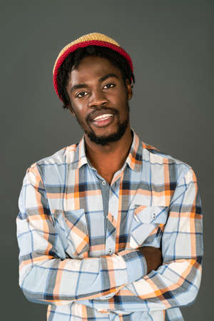 Young smiling black man in afro hat standing with arms folded looking at camera. Cheerful african american young man in plaid shirt looking at camera isolated on gray background.