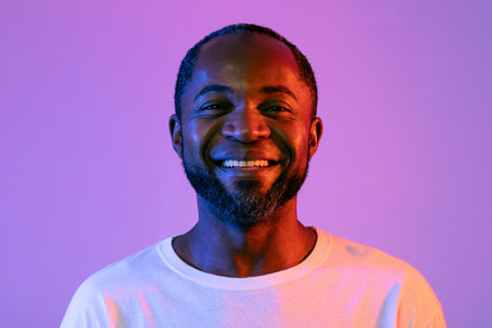 Closeup portrait of handsome black man on neon background