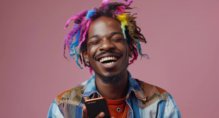 A man with vibrant multicolored hair is using a cell phone outdoors.