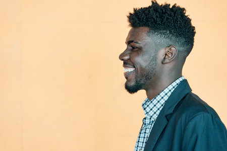 Happy Emotions. Portrait Of Laughing African American man Posing Over yellow Background, Cheerful Young Curly Black man Having Fun, Having Good Mood, Side View Shot, Copy Space