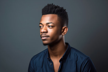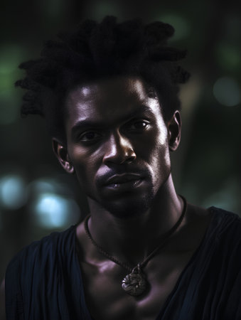Close-up portrait of a thoughtful African man with a serene expression, in a natural green setting.. AI Generation