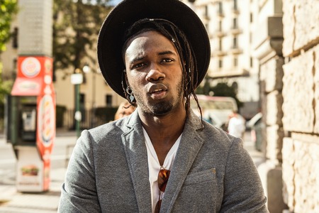 Guy with hat dressed in style and modern in the city. Black guy