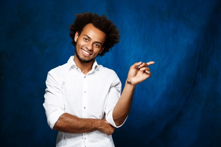 Young handsome african man in white shirt smiling, pointing finger in side over blue background. Copy space.