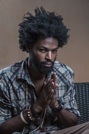 portrait of an Afro- Dominican in a checkered shirt folded his hands, something in mind