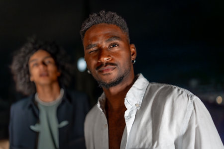 Latin man in white t-shirt looking at camera during night party on a rooftop