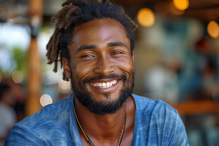 Portrait of a handsome young African man smiling at the camera while sitting in a cafe