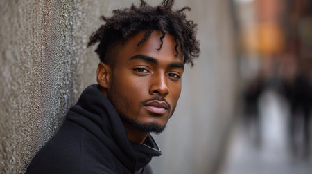 Portrait of stylish curly handsome black man standing outdoors, fashionable african american man posing and looking to the side against rocks background