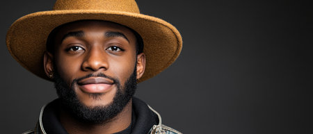 A young man presents a charming smile while wearing a trendy hat in a professional studio environment.