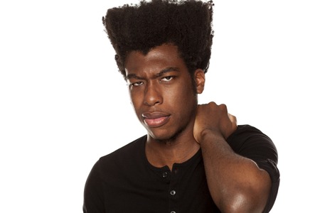 Portrait of young african american man with pain in his neck on white background