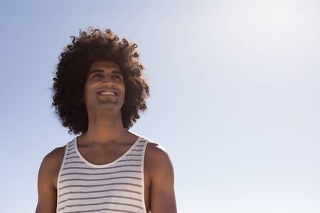 Mixed race man enjoying his time at the beach with his friends on a sunny day, looking away and smiling