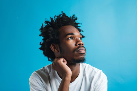 Atmospheric portrait of a thoughtful young man gazing upwards with a moody blue overlay