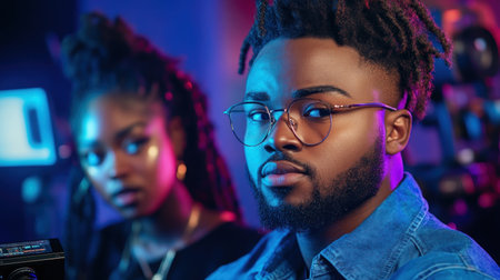 Black history month. portrait of young African American man in neon light. AI Generated
