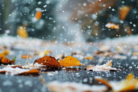 Autumn leaves on pavement with first snowfall, signaling the change from fall to winter AI