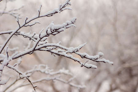 sprig of tree covered with snow on a blurred background. winter background