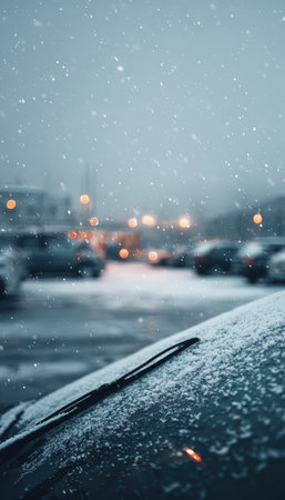 A car windshield covered in snow with frozen wipers, set against a blurred parking lot background. The image captures a moody, overcast atmosphere with high-detail realism.