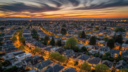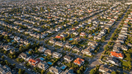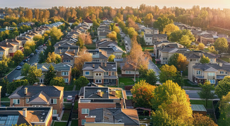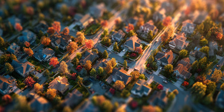 An overhead view reveals a suburban neighborhood comprised of houses and trees. The scene displays a variety of colors, featuring warm tones and varying textures. The composition creates a sense of depth, suggesting an outdoor environment during the day, suitable for various editorial and commercial applications.