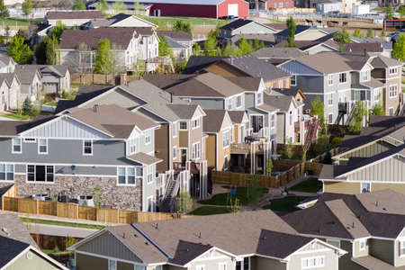 An aerial view captures a vibrant suburban neighborhood on a sunny day. The image showcases a variety of colorful houses with different roof styles, set amidst lush green foliage. Many of the houses have windows that provide glimpses into the homes' interiors, hinting at the families and lives that inhabit this peaceful community.