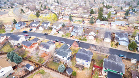 residential area of Fort Collins in northern Colorado in late fall scenery, aerial view at sunrise