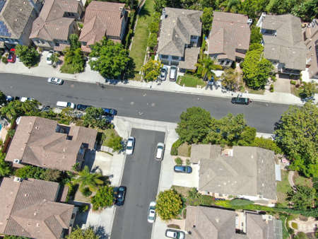 Aerial top view of middle class subdivision neighborhood with residential villas next to each other in San Diego County, California, USA.