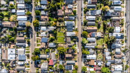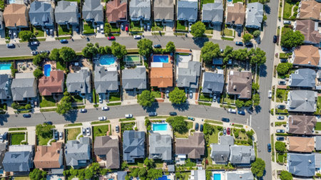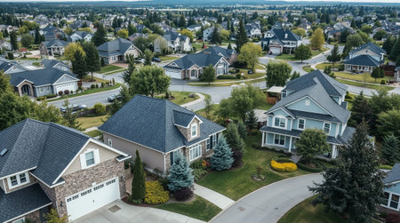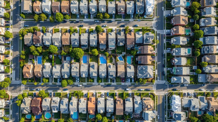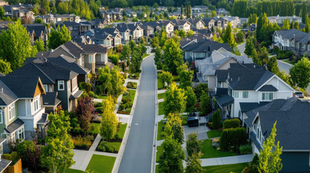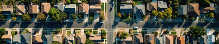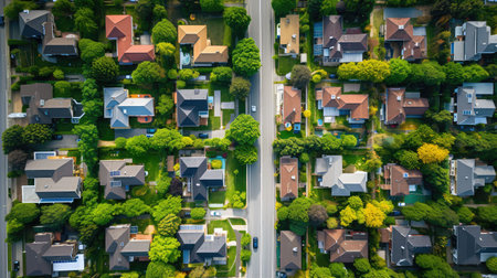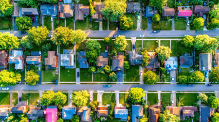 An overhead view reveals a suburban neighborhood with houses and lush green trees. The composition includes streets, lawns, and various house designs. Natural sunlight bathes the scene, highlighting textures and colors. This image is suitable for illustrating community, real estate, and environmental themes, ideal for multiple commercial applications.