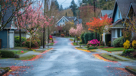 quiet residential street, with houses lined up in perfect symmetry, created with generative ai