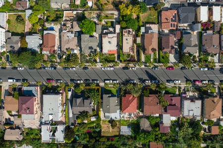 Aerial, high altitude view of Los Angeles residential neighborhood