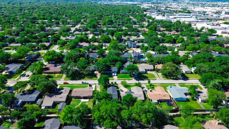 Panoramic top view urban sprawl suburbs Dallas during autumn season