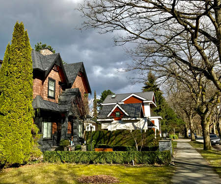 Street of residential houses with concrete pathways and green lawns in front on cloudy day in Vancouver, Canada - november, 2019.