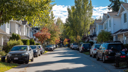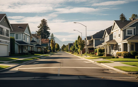 quiet residential street, with houses lined up in perfect symmetry, created with generative ai