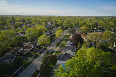 Aerial view of a well organized suburban neighborhood with housing blocks, tree cover, and calm community streets