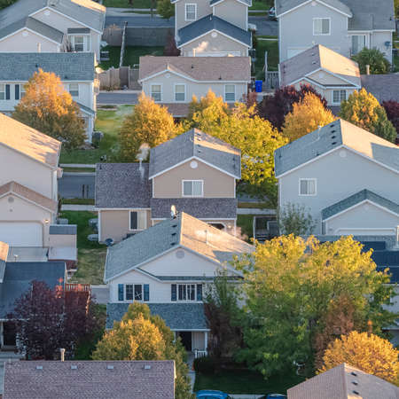 An aerial view captures a vibrant suburban neighborhood on a sunny day. The image showcases a variety of colorful houses with different roof styles, set amidst lush green foliage. Many of the houses have windows that provide glimpses into the homes' interiors, hinting at the families and lives that inhabit this peaceful community.