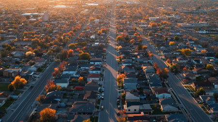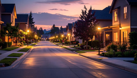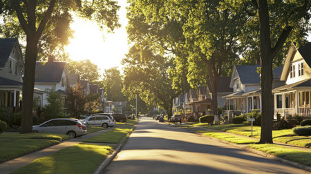 Peaceful suburban street with modern homes, trees, and glowing golden hour sunlight highlighting community living and residential comfort.