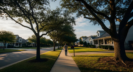 A person walks away from the camera down a sidewalk in a quiet suburban neighborhood during the golden hour. Large oak trees cast long shadows across the green lawns and street, framing the row of traditional houses. The scene evokes a sense of peace and everyday life in a residential area.