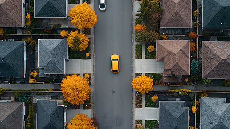 The image captures a vibrant suburban neighborhood with autumn foliage showcasing bright yellows and oranges. A solitary yellow car drives through a peaceful, tree-lined street.