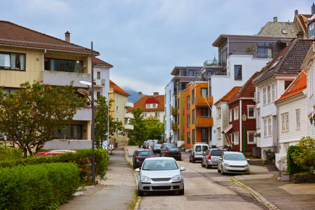 A row of houses lines a street, each with a distinctive design and landscaping. Cars are parked along the curb, suggesting a residential area. The cloudy sky provides even lighting across the scene, highlighting the architectural details. This image could be used for real estate, lifestyle, or design-related content.