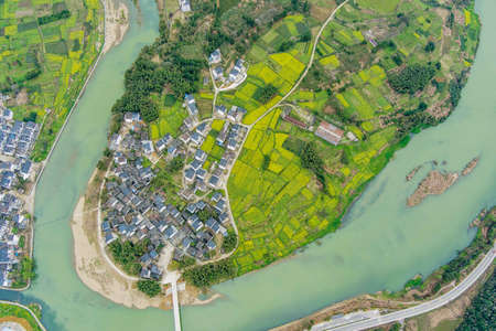 Aerial view of rape fields in Taojiang, Taizhou, China