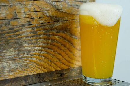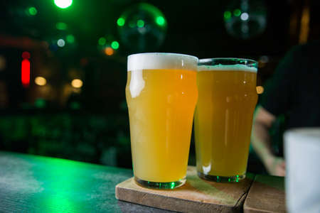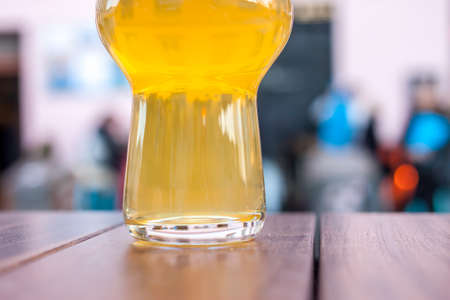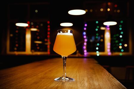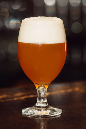 A glass of draft beer with foam on wooden counter with blur and bokeh background.