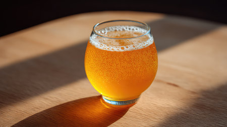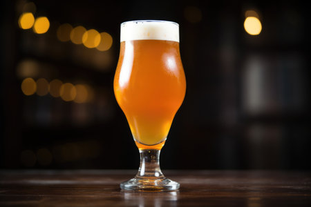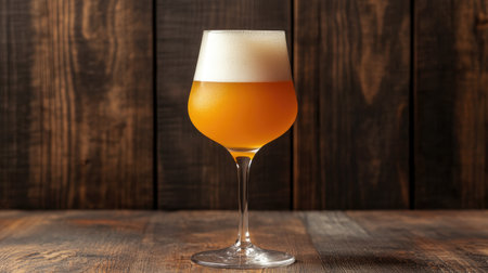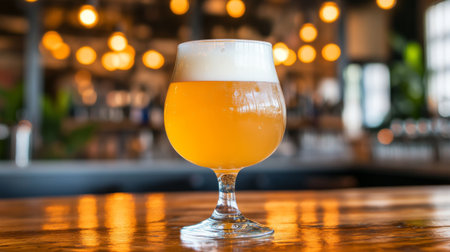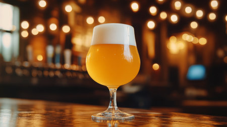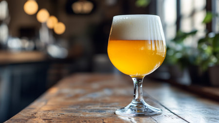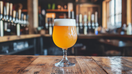 Golden beer shines in a stylish glass on a rustic wooden table. The warm atmosphere of the bar enhances the enjoyment of this refreshing beverage.