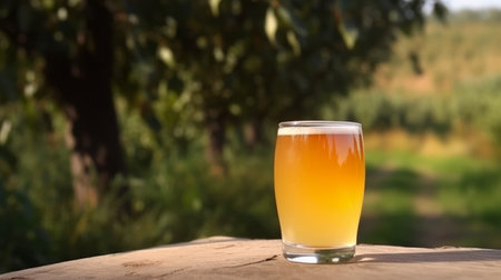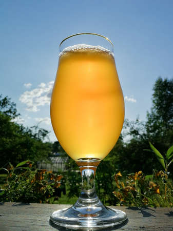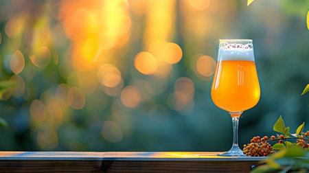 A beautiful glass of craft beer filled with golden liquid and frothy foam, presented on a wooden table amidst lush greenery, perfect for relaxation.
