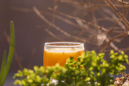 A delicious homemade orange juice, freshly squeezed in the morning, healthy and full of vitamins, rests in the glass by the window before breakfast. Vegetarian drink for a healthy diet.