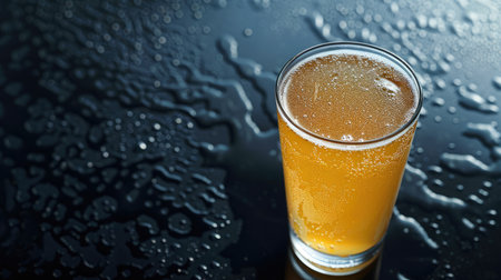 A close-up of a tall glass of golden beer with a perfect foamy head, set against a dark rustic background, condensation droplets on the glass for a refreshing look.