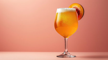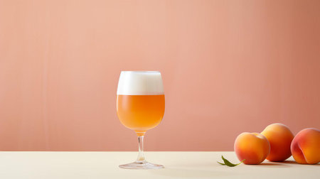 A minimalist shot of nectarine beer in a sleek glass, with a slice of nectarine on the rim, against a pastel-colored background.