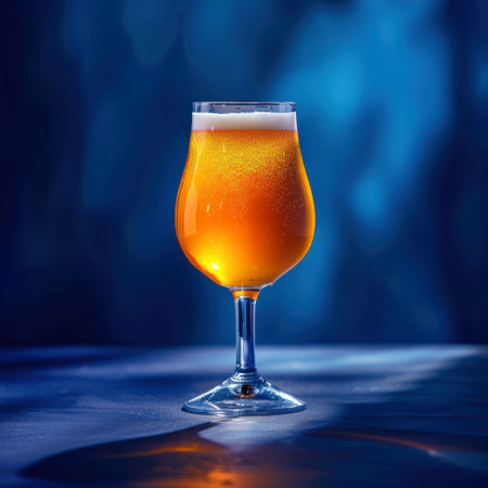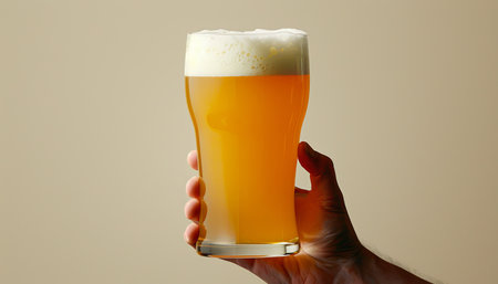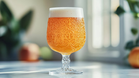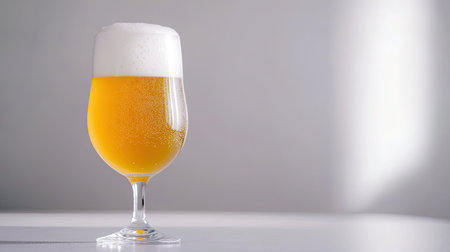 A beautifully styled beer glass filled with amber beverage and topped with a rich foam. Ideal for capturing the essence of relaxation and celebration.